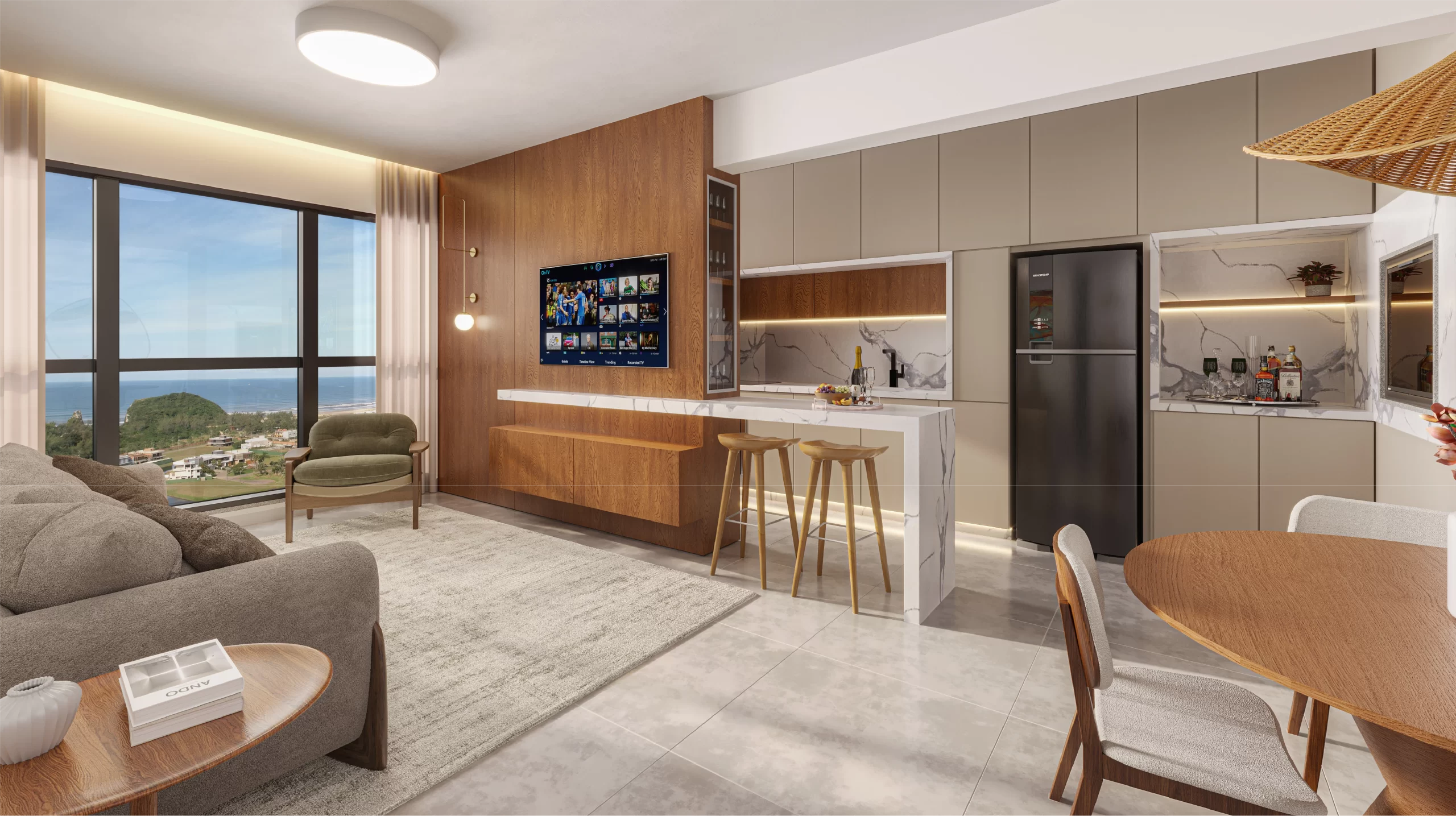 O rooftop reúne um ESPAÇO GOURMET completo, com churrasqueira parrilla, cozinha equipada e espaço para 16 pessoas, ideal para celebrar bons momentos.